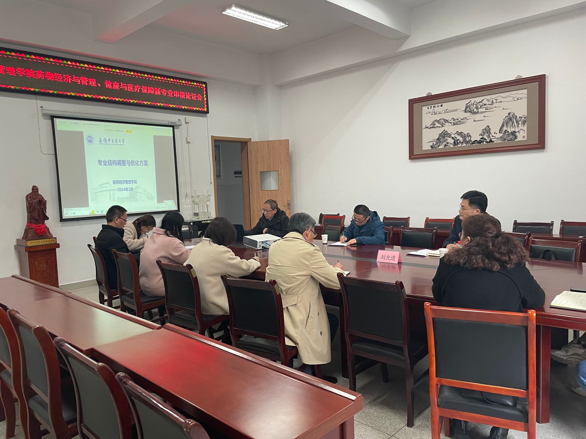 3月13日,医药经济管理学院召开药物经济与管理、健康与医疗保障新专业申报论证会。会议邀请了安徽医科大学卫生管理学院孙江洁教授、安徽天星医药集团有限公司刘光进副总经理等专家论证指导。学院领导、各教研室主任、各专业负责人、各科室负责人参加会议。会议由学院副院长陶群山主持。