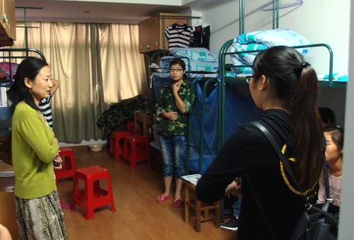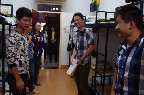 同时,周书记带领辅导员们深入新生宿舍,与我院2012级新生开展亲切座谈,周书记仔细询问了新同学入校以来的生活情况及军训情况,对同学们提出的问题予以一一解答,强调在宿舍一定要注意用电安全,并嘱咐同学们如果遇到生活上或者学习上有什么困难要及时反映给辅导员或其他老师。