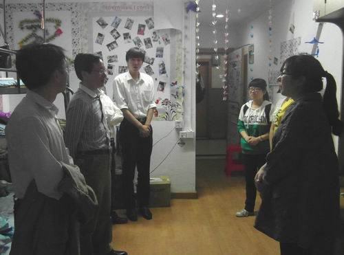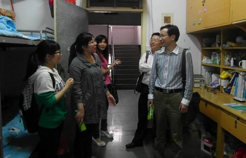 为深入了解学生的学习生活情况,加强学生宿舍安全卫生教育。5月5日下午,我院党总支书记吴成海、党总支副书记黄学武、全体辅导员,深入宿舍看望学生,同时对该院的学生宿舍卫生安全进行深入了解。 这次检查主要针对该院东西区所有学生宿舍,针对各个寝室的卫生状况、居住情况和可能存在的安全隐患进行了解和排查。吴成海代表学院党政领导与同学们进行亲切会谈,了解同学们的学习和生活情况,关心同学们的健康成长成才。