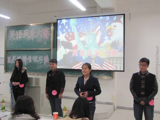 为了丰富同学们的课余生活,提高同学们对英语的学习热情,我院于2013年11月29日在少荃湖校区举办新生英语风采大赛,比赛形式为英文诗歌朗诵。此次大赛的评委老师有国际教育交流学院韩桂敏、董睿,以及我院辅导员范思敏、戴婷婷。