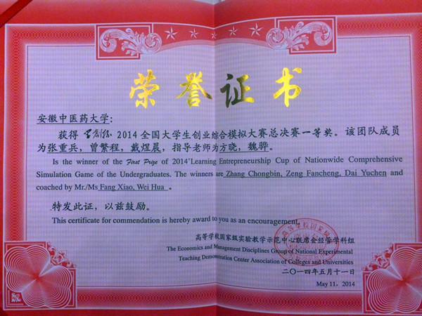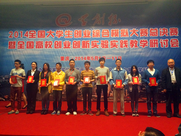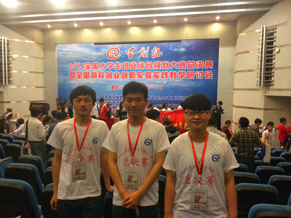 日前,在第一届“学创杯”2014年全国大学生创业综合模拟大赛总决赛中,由我院张重兵、曾繁程、戴煜晨三位同学组成的代表队荣获总决赛一等奖。这也是我院代表队第四次在全国大赛中取得优异成绩。 本次大赛由国家级实验教学示范中心联席会经济和管理学科组主办,重庆工商大学、武汉大学承办,贝腾科技有限公司协办。