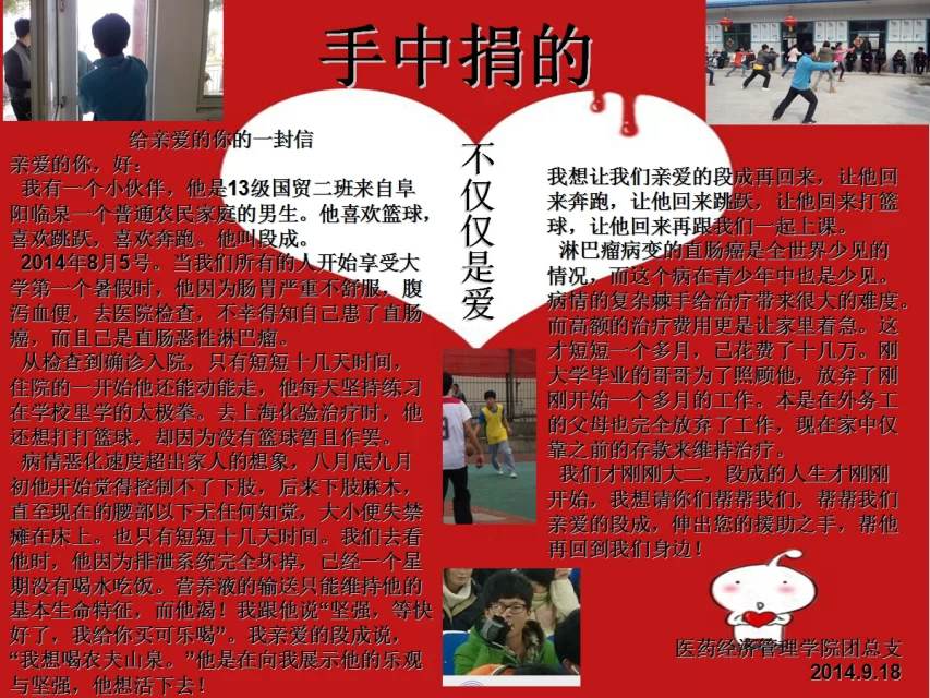 在得知段成的情况后,2013级国贸2班学生,在学院团总支的支持下,联合学校华佗爱心社,向全校发出募捐倡议,利用网络加强宣传,迅速在校内外发起了“奉献爱心、传递温情”的募捐活动。