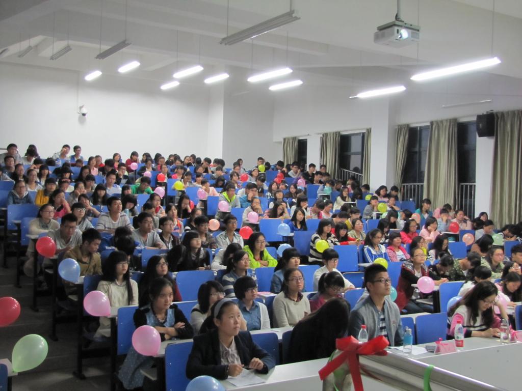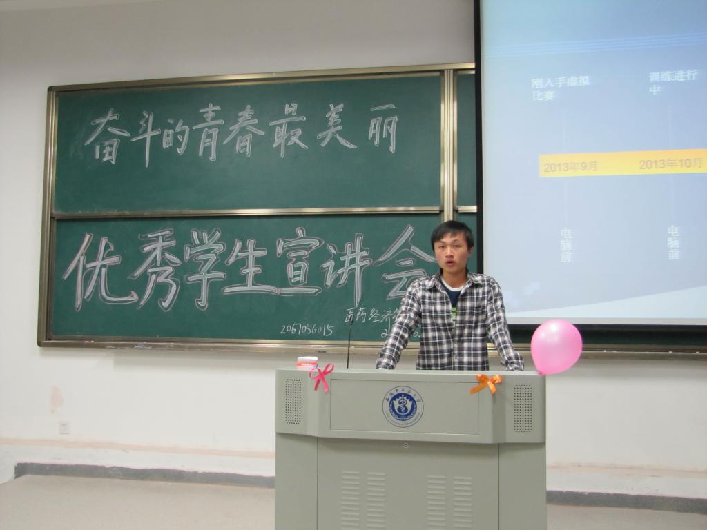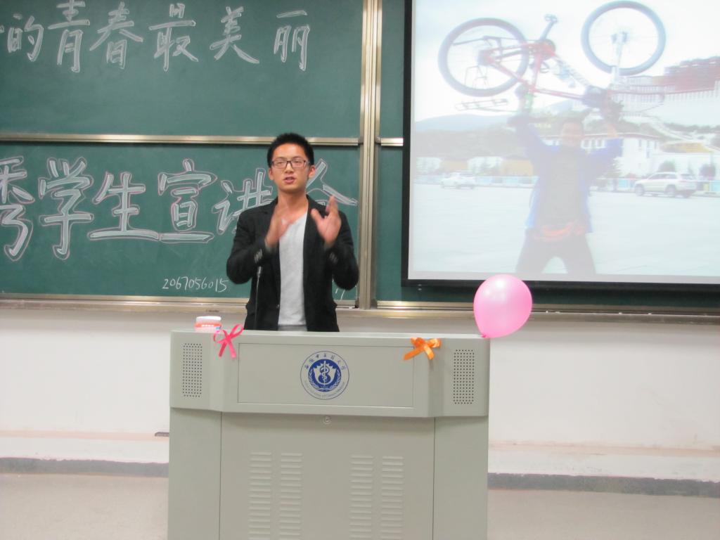 其中, 获得过“挑战杯”省赛一等奖等多类奖项的曾繁程同学,向大家讲述自己参加比赛的曲折经历,提出“不管遭遇怎样的挫折,我们都要用克服的心态去面对它们”的建议。与队友从成都到拉萨的骑行者江涛,展示了他行进途中的美丽照片,并应同学要求演唱了小段康定情歌。在这段历时29天的骑行过程中,江涛同学不畏艰辛,用他的行动鼓励大家要勇敢追寻梦想。获得国家奖学金的黄晓婷同学,跟大家分享了自己的学习经验。建议同学们保持良好的生活习惯,要经常锻炼身体,并希望大家学会合理规划自己的大学生活。而在相声与演讲方面有着耀眼表现的黄诚同学,认为“生活需要梦想,梦想需要坚持”,通过自己的求职经历向同学们建议,一定要敢于推荐自己。