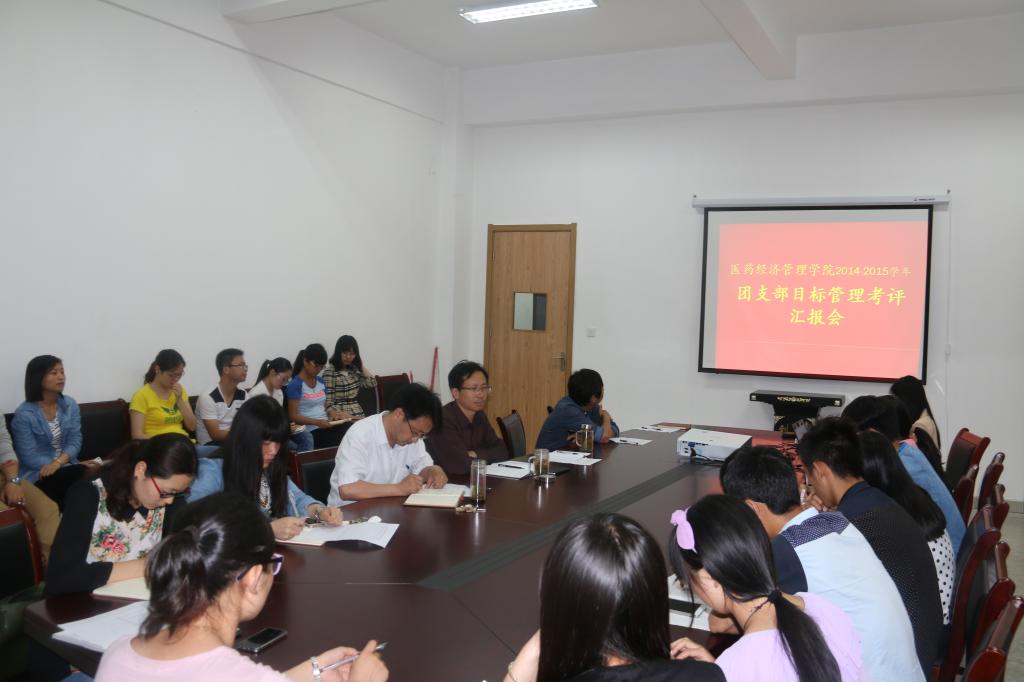 5月14日晚,我院举办2014-2015学年团支部目标管理考评汇报会。院党总支书记吴成海、副书记黄学武、副院长丰志培及各班辅导员出席,听取各班团支部的工作汇报并进行打分。