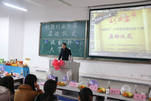 十二月九日,“诚毅杯”大学生创新创业大赛启动仪式在公共教学楼B326举行。本次活动由北京诚毅股份有限公司主办,安徽中医药大学承办。医药经管学院党总支书记吴成海、药学院党总支书记吴达武、副书记金晓琴、副院长陈卫东、北京诚毅股份有限公司董事长以及部分公司高管、经管学院辅导员方悦出席此次仪式。启动会旨在鼓励同学们投入十二分热情参与比赛,赢得精彩。