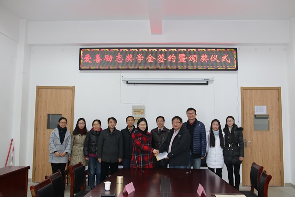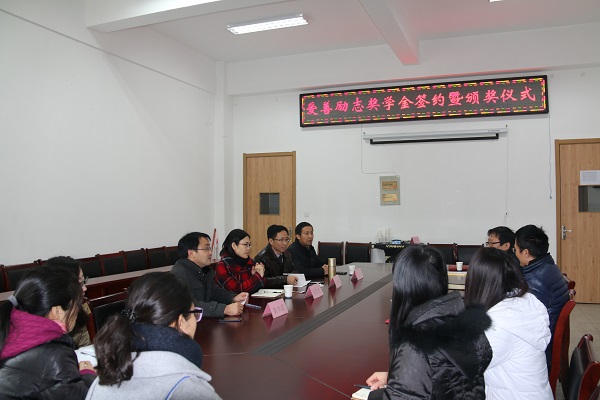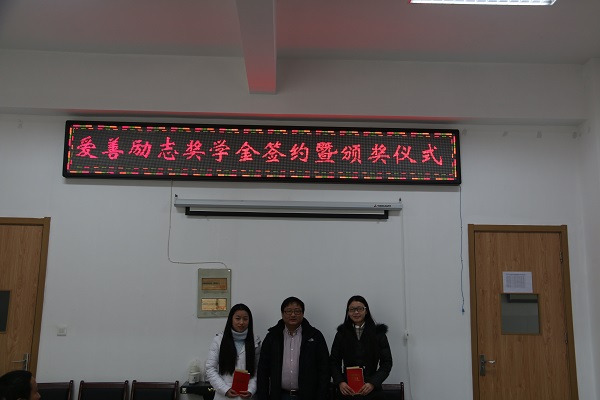 12月23日,爱善励志奖学金签约暨颁奖仪式在医药经济管理学院会议室举行。医药经济管理学院张连生校友为回馈母校的培养之情,个人捐赠设立“爱善励志”奖学金。校学生处处长王红松、副处长冯祥、护理学院副处级辅导员方晓,医药经济管理学院党总支书记吴成海、副书记黄学武、经管院部分老师及获奖学生参加。签约暨颁奖仪式由黄学武主持。