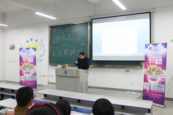3月15日,经管院举办的首届“国元证券杯”安徽省大学生金融投资创新大赛培训讲座再次开讲,少荃湖校区A401教室座无虚席。国元证券的陈强、王凯经理就如何使用“大智慧”软件模拟股票交易,帮助同学们解决比赛实际问题。