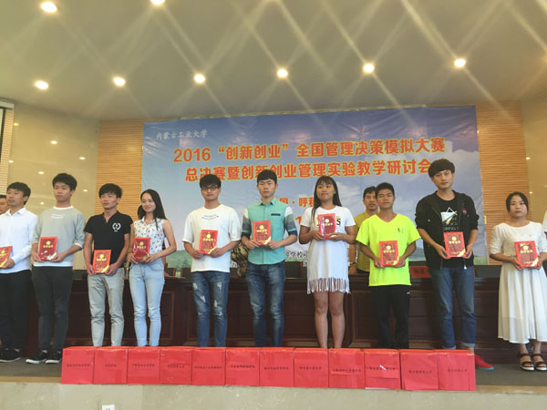 7月19日,2016“创新创业”全国管理决策模拟大赛总决赛暨管理实验教学交流研讨会在内蒙古工业大学拉开帷幕。我院许思洁、李国栋、郭家玲三名学生组成的“狐狸在家吃果冻”团队,经过8小时的激烈比赛,在全国96支参赛高校队伍中脱颖而出,最终获得全国总决赛一等奖。本次大赛在教育部高等学校工商管理类专业教学指导委员会领导下,由全国管理决策模拟大赛组委会主办,内蒙古工业大学承办。我校代表队已连续六年入围“创新创业”全国管理决策模拟大赛总决赛并取得优异成绩。