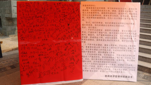 9月26日,医药经济管理学院举办“三不”签名会。活动围绕“不带早点进教室,不用手机在课堂,不玩游戏到深夜”的主题展开,倡导营造良好的校园学习氛围。