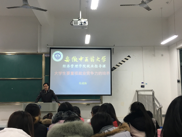 12月27日晚,医药经济管理学院党总支书记吴成海在教学楼A110,给14级国贸班学生上就业指导课,谈就业竞争力的培养。