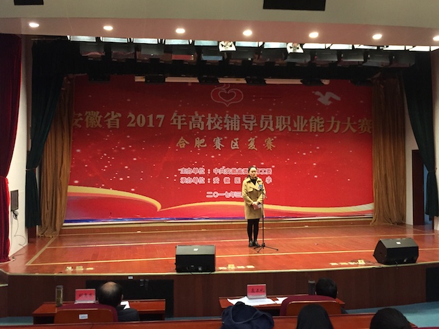 经各高校初赛遴选推荐,共有59名选手参加合肥赛区复赛。比赛由笔试、主题班会、案例分析、主题演讲、谈心谈话五个环节构成。经过五轮激烈比拼,方悦、王向阳均获得合肥赛区复赛三等奖的好成绩。