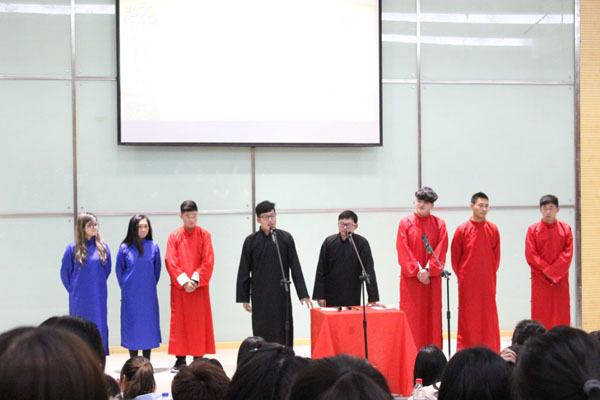一段节奏欢快的快板表演拉开了晚会序幕,全体相声社成员的开场小唱则吊足了观众胃口。两名女同学的对口相声《电视情缘》,使大家捧腹大笑,群口相声《扒大褂》,同学们演出卖力,获得阵阵掌声,单口相声《雨夜凶宅》给大家带来一段“笑不出”的相声体验。