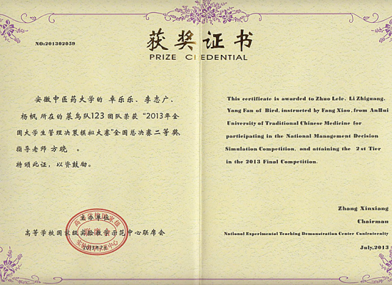 在刚刚结束的第五届全国大学生管理决策模拟大赛总决赛中,由我院卓乐乐、李志广、杨帆三位同学组成的“菜鸟123”团队,不畏强手,敢于拼搏,最终获得总决赛全国二等奖。