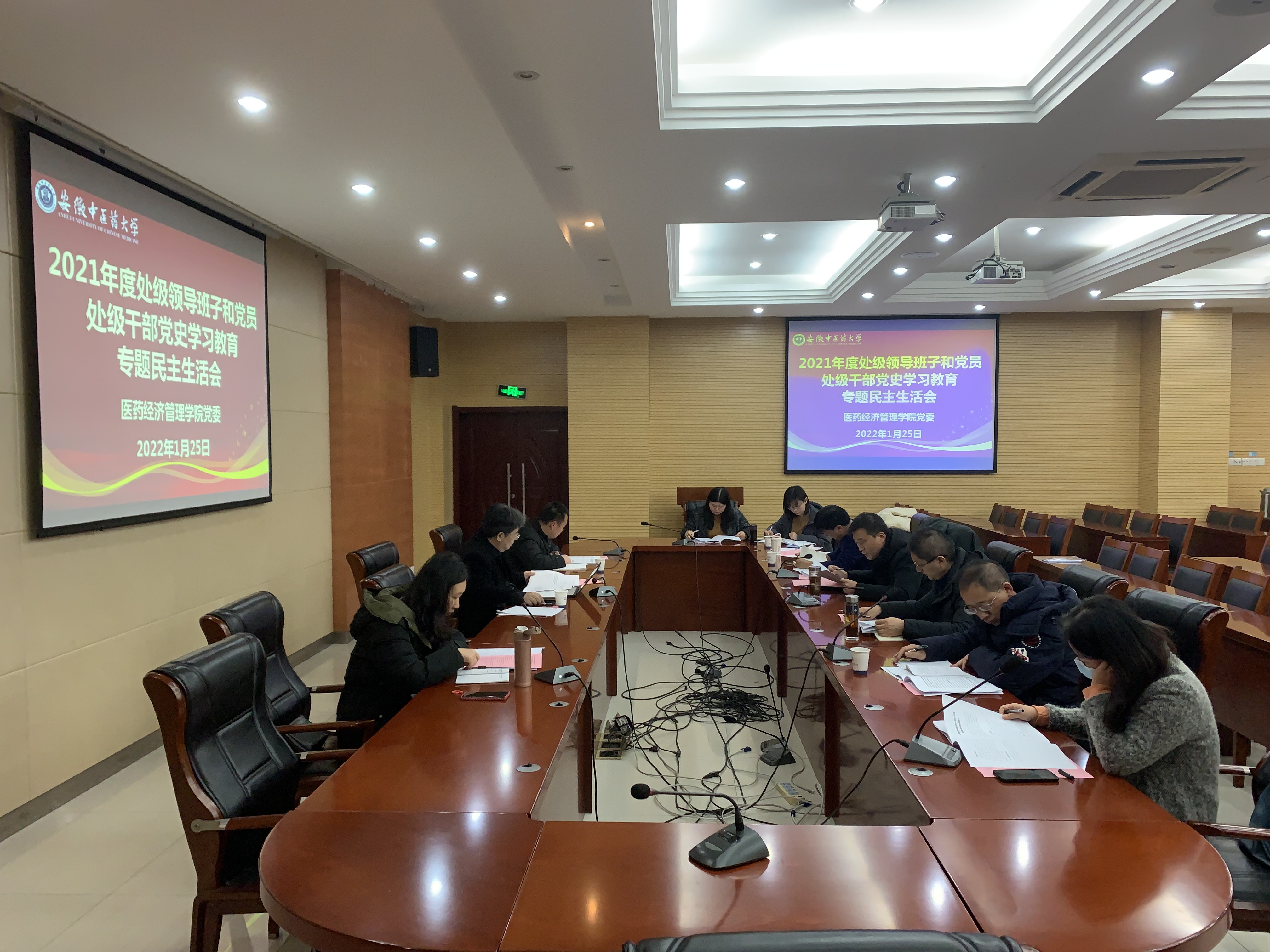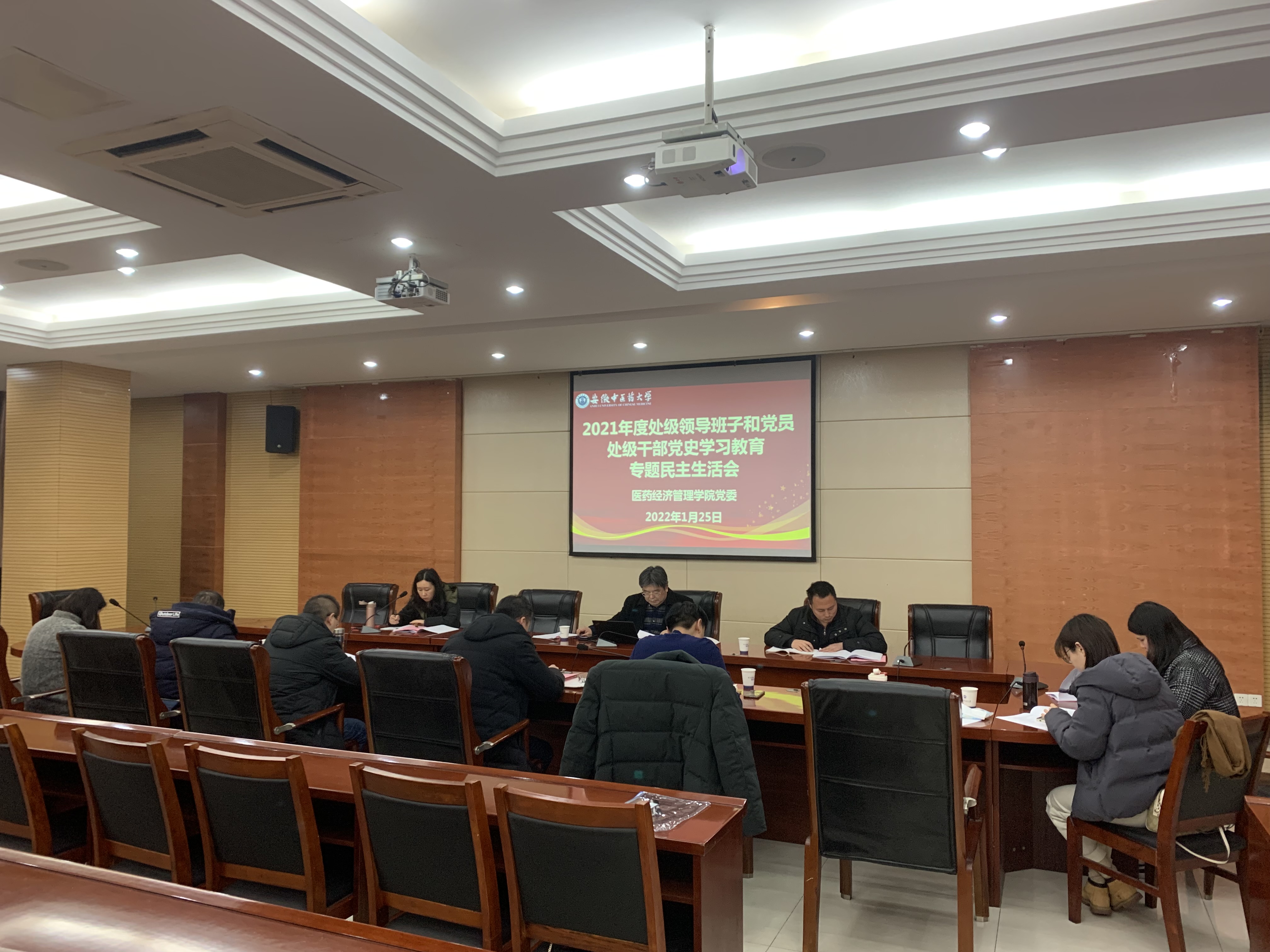 1月25日,医药经济管理学院召开2021年度处级领导班子和党员处级干部党史学习教育专题民主生活会,学校党委常委、副校长、校党史学习教育专题民主生活会第五指导组组长魏骅,人事处副处长、校党史学习教育专题民主生活会第五指导组成员唐闻新到会指导,学院党政领导、党委委员参加,会议由学院党委书记冯鑫主持。校党史学习教育专题民主生活会第五指导组成员李兴兴同志列席会议。
