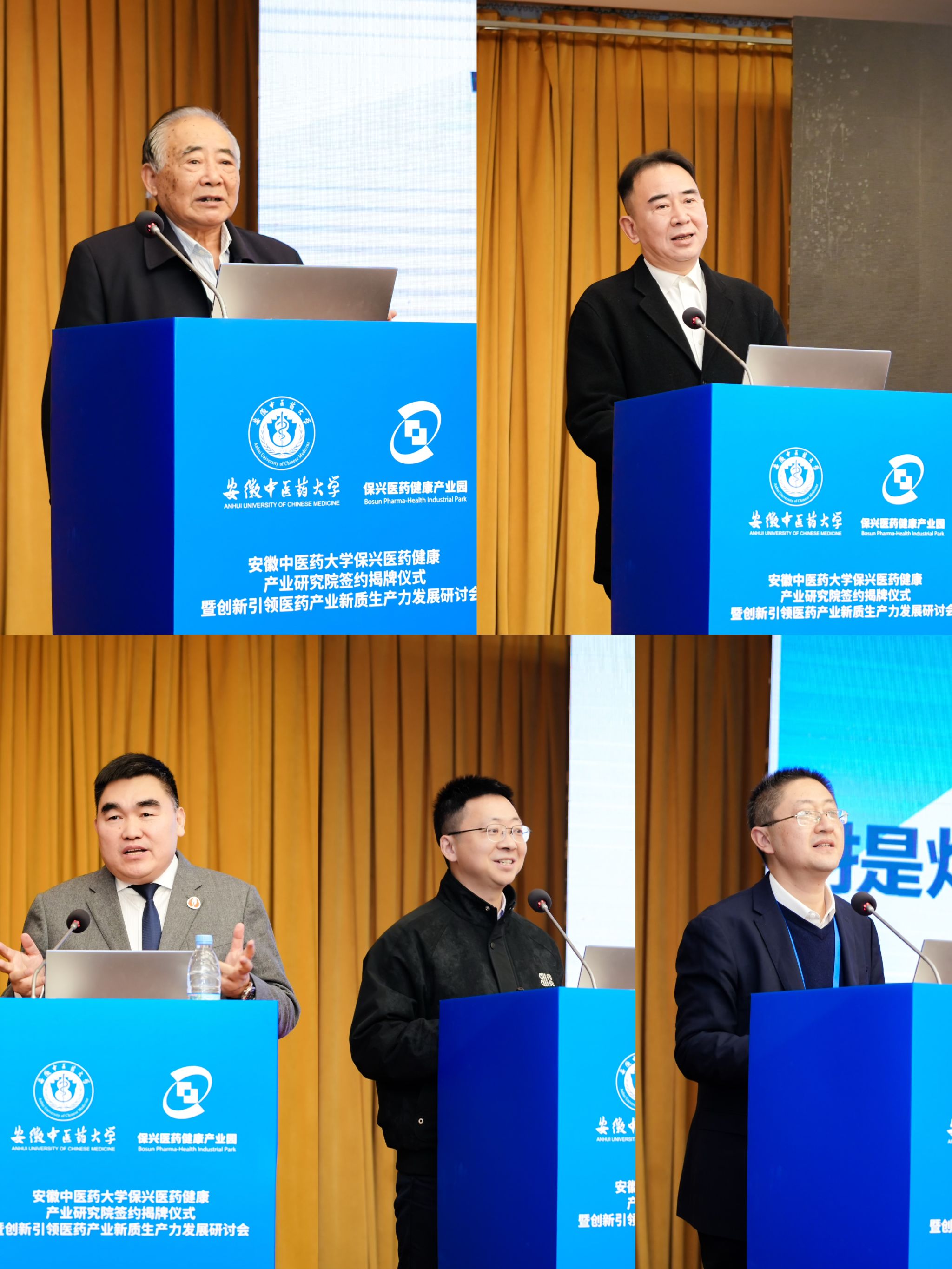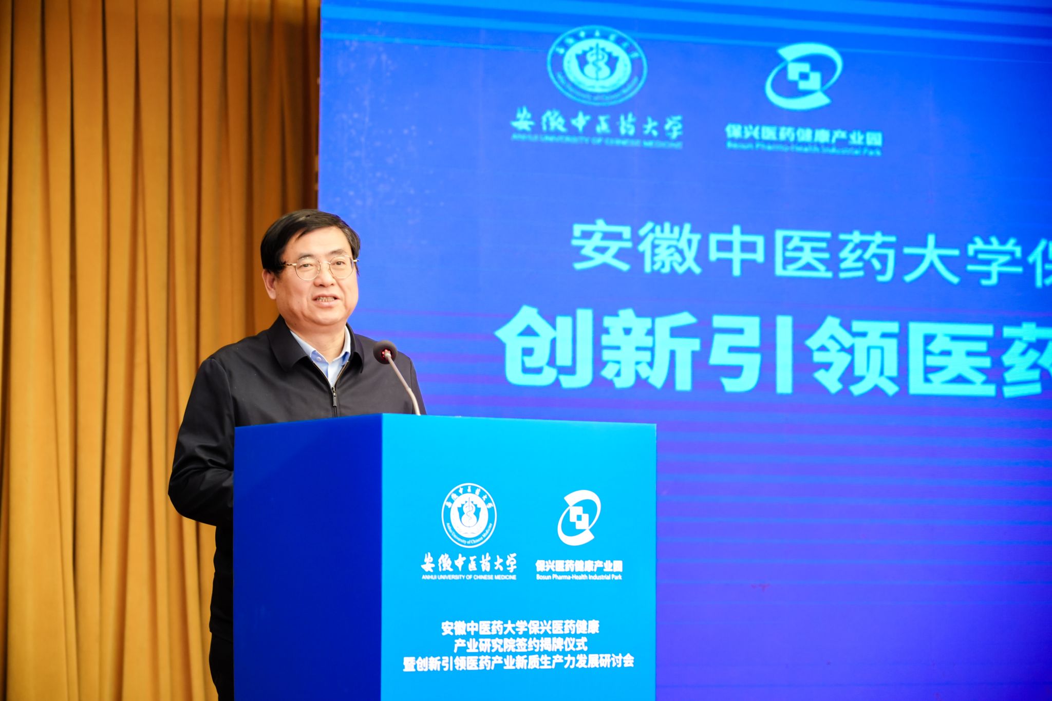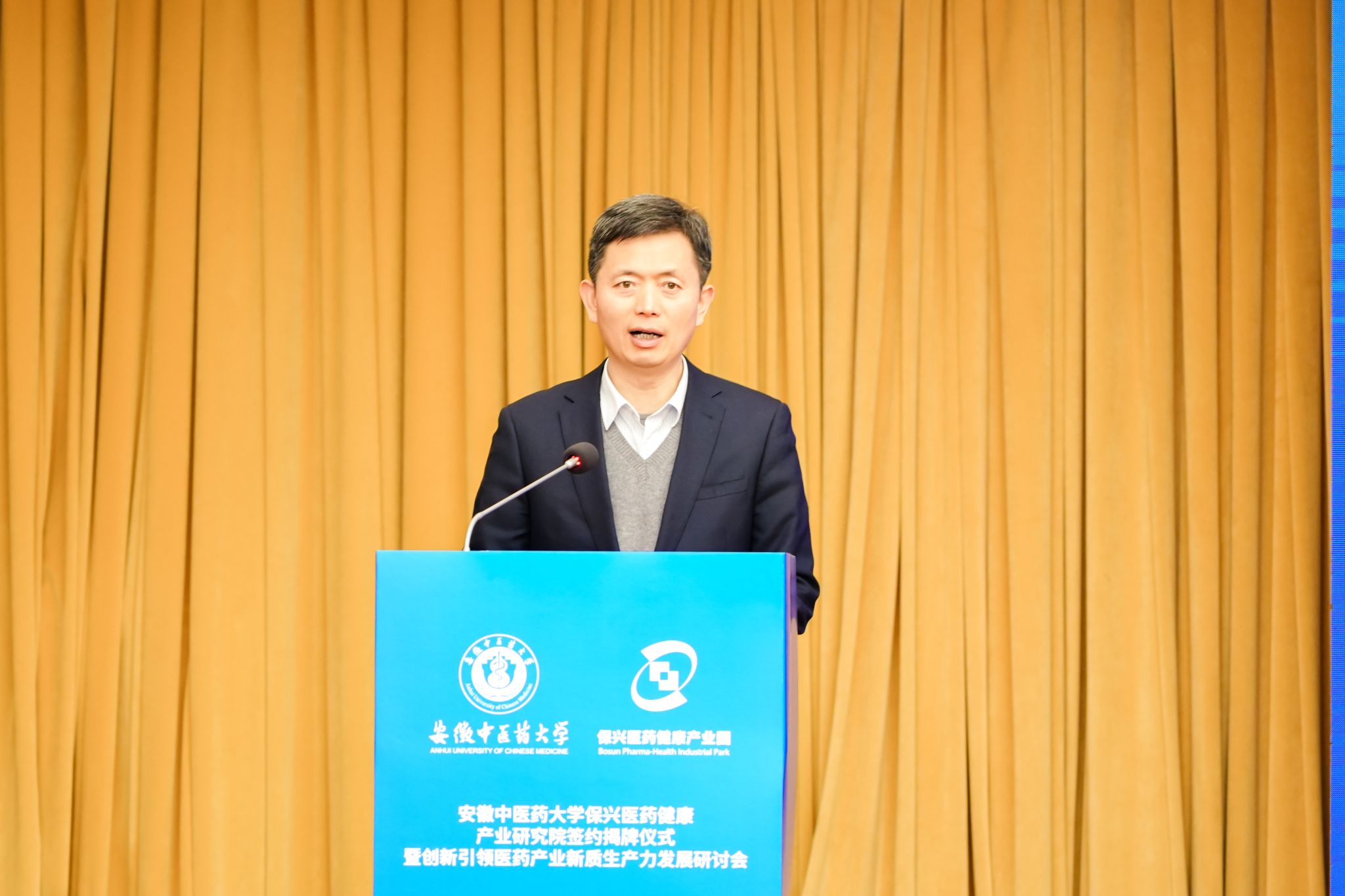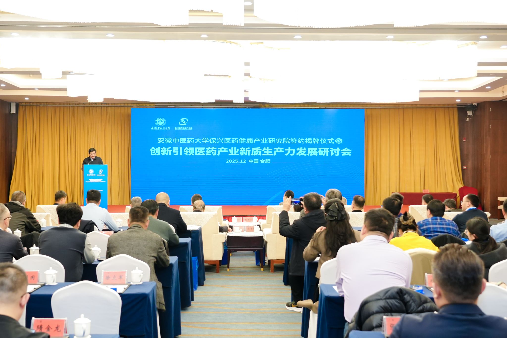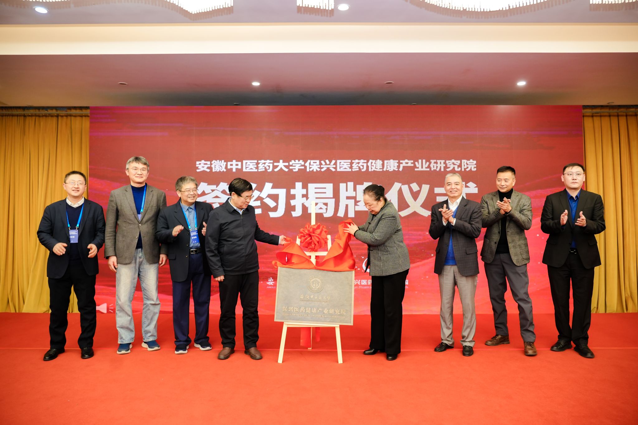 12月18日,安徽中医药大学与保兴产业园共建保兴医药健康产业研究院签约揭牌仪式暨“创新引领医药产业新质生产力发展”研讨会在合肥成功举办。国家药监局原副局长惠鲁生,省人大常委会原副主任、省总工会原主席宋国权,安徽省卫生健康委党组书记刘同柱,安徽省生命健康产业推进组办公室主任徐雪晖,安徽省药品监督管理局副局长张磊,阜阳市太和县县委副书记、县长陈建华,安徽省社科联原党组书记、研究员程必定,北京大学政府管理学院企业与政府研究所所长宋磊,保兴医药健康产业园董事长张建强,学校党委书记谢瑞瑾等出席签约揭牌仪式。仪式由校党委常委、副校长魏骅主持。