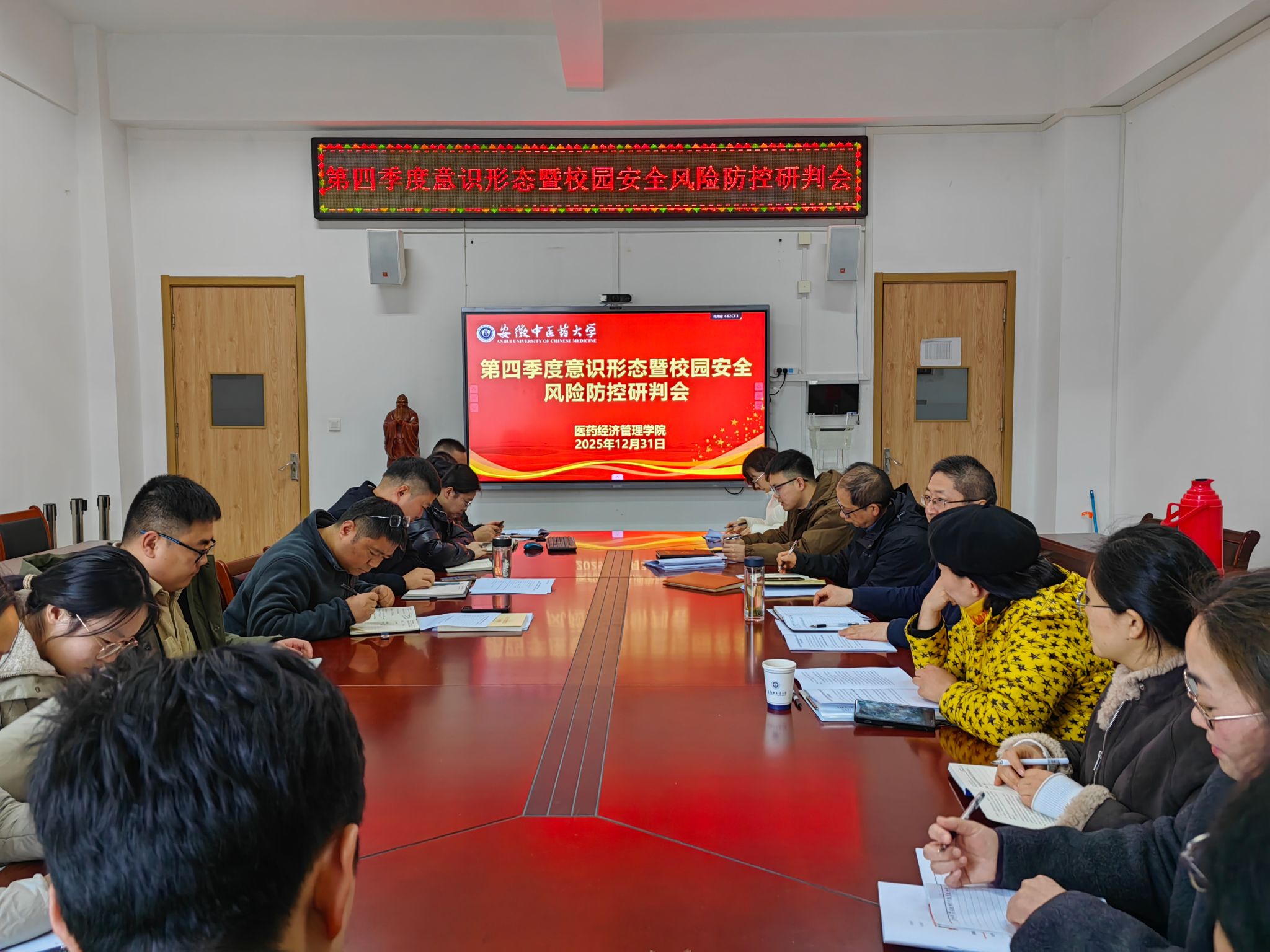 12月31日,医药经济管理学院召开2025年第四季度意识形态暨安全风险防控研判会。学院党政领导、党委委员、各教研室(中心)主任、各办公室负责人、全体专兼职辅导员参加会议。会议由学院党委书记张军主持。