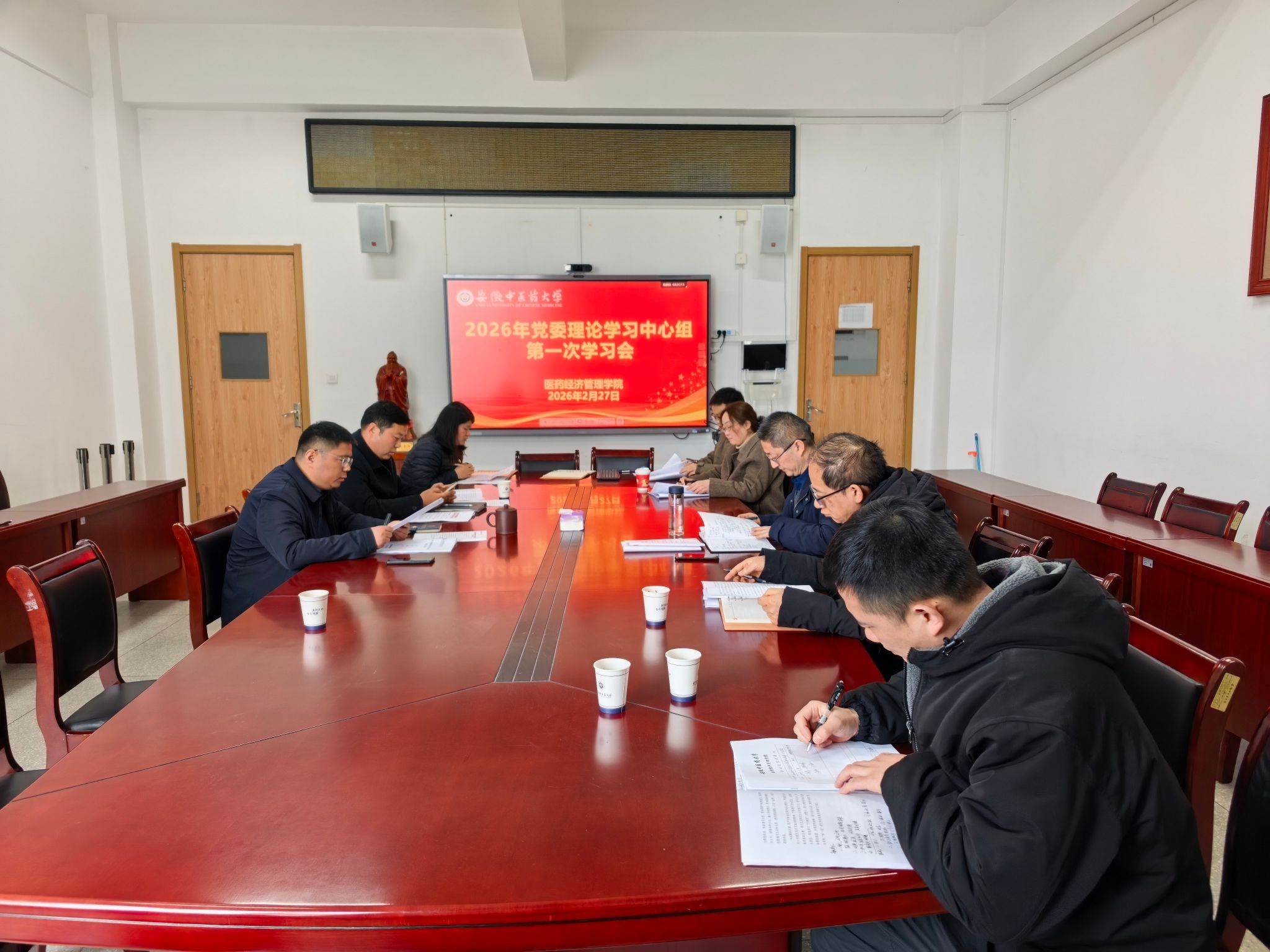 2月27日,医药经济管理学院召开党委理论学习中心组学习会,围绕“推进全面从严治党,为学院‘十五五’良好开局奠定坚实政治保障”主题进行深入学习研讨。学院领导班子成员、党委委员参加会议,会议由学院党委书记张军主持。