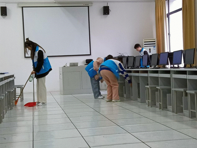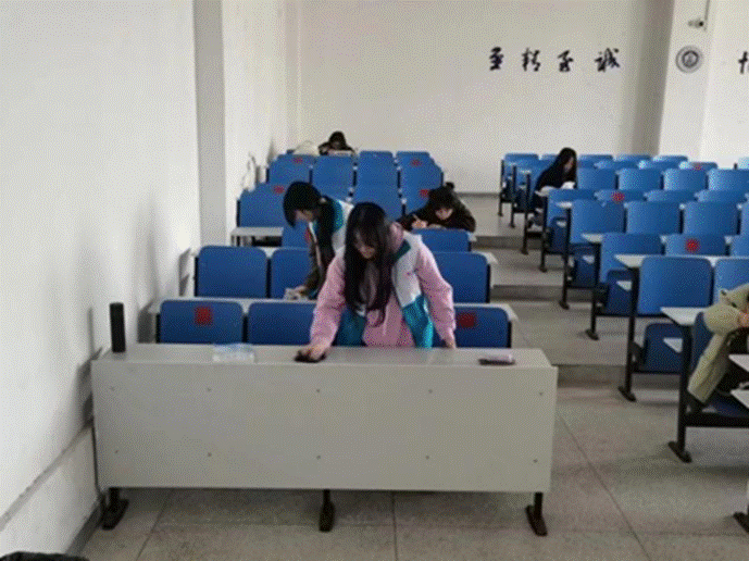 3月27日,志愿者在教学楼保洁负责人的指导下,对教学楼A区、B区的教室桌面,抽屉以及座椅进行了清洁。