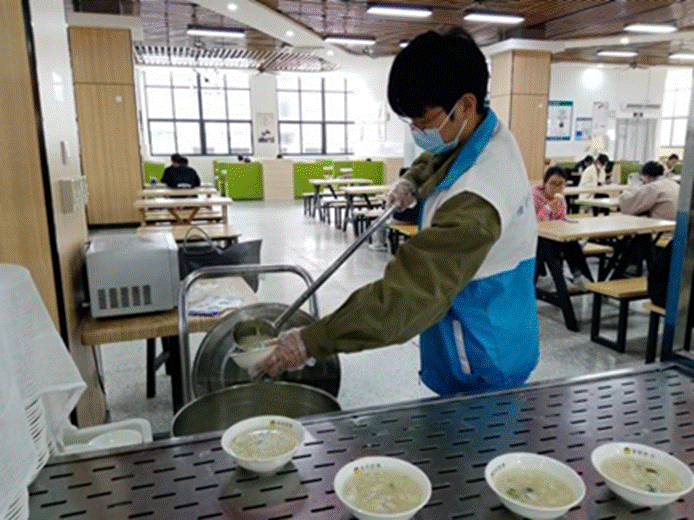 3月26日,志愿者来到食堂,协助食堂工作人员擦桌子,收盘子,盛汤。