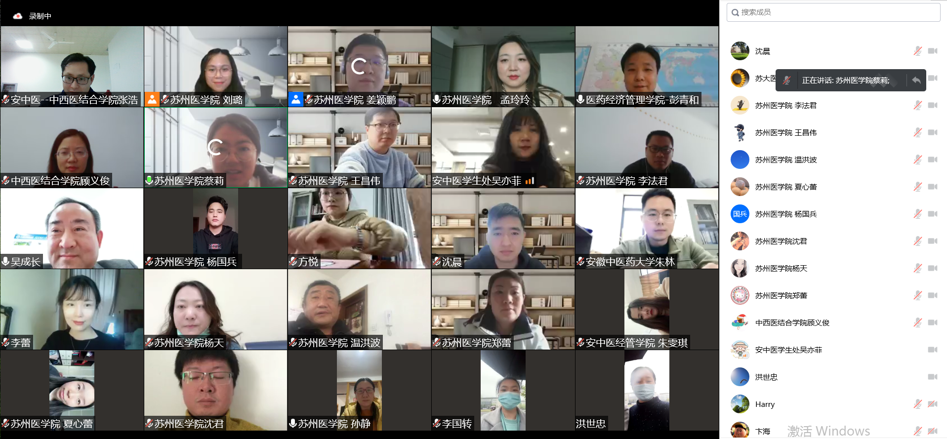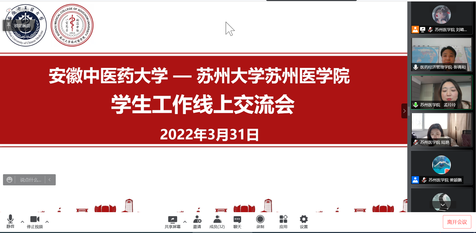 为进一步完善医药经济类人才培养体系,提升人才培养质量,学习借鉴国内一流医学院校在学生工作方面的宝贵经验和成功做法。3月31日,我校医药经济管理学院牵头举办,联合中西医结合学院、护理学院同苏州大学苏州医学院在“云端”进行学生工作交流。苏州大学苏州医学院党工委书记钱福良、副书记孟玲玲,我校护理学院党委书记吴成长、副书记卞海,中西医结合学院党委副书记顾义俊、医药经济管理学院党委副书记彭青和、校学生处吴亦菲老师和两校四院学工、团委、就业等办公室主任以及专兼职辅导员近40名老师参加了“云”交流。