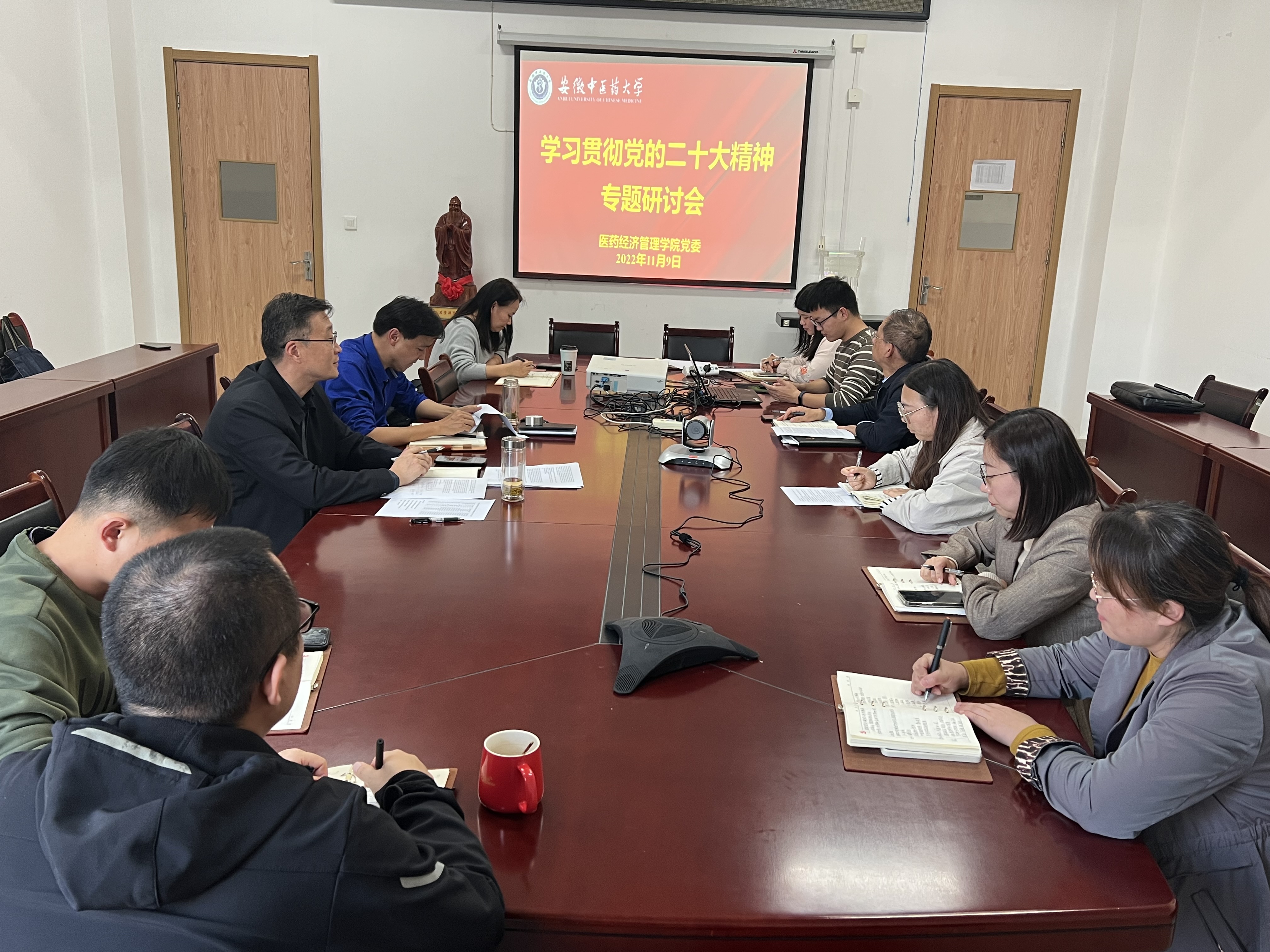 11月9日下午,医药经济管理学院党委召开2022年第十一次中心组(扩大)学习会暨支部书记例会,本次会议的主要内容是学习传达党的二十大精神。学院党政领导、党委委员、各党支部书记参加会议。会议由学院党委书记冯鑫主持。