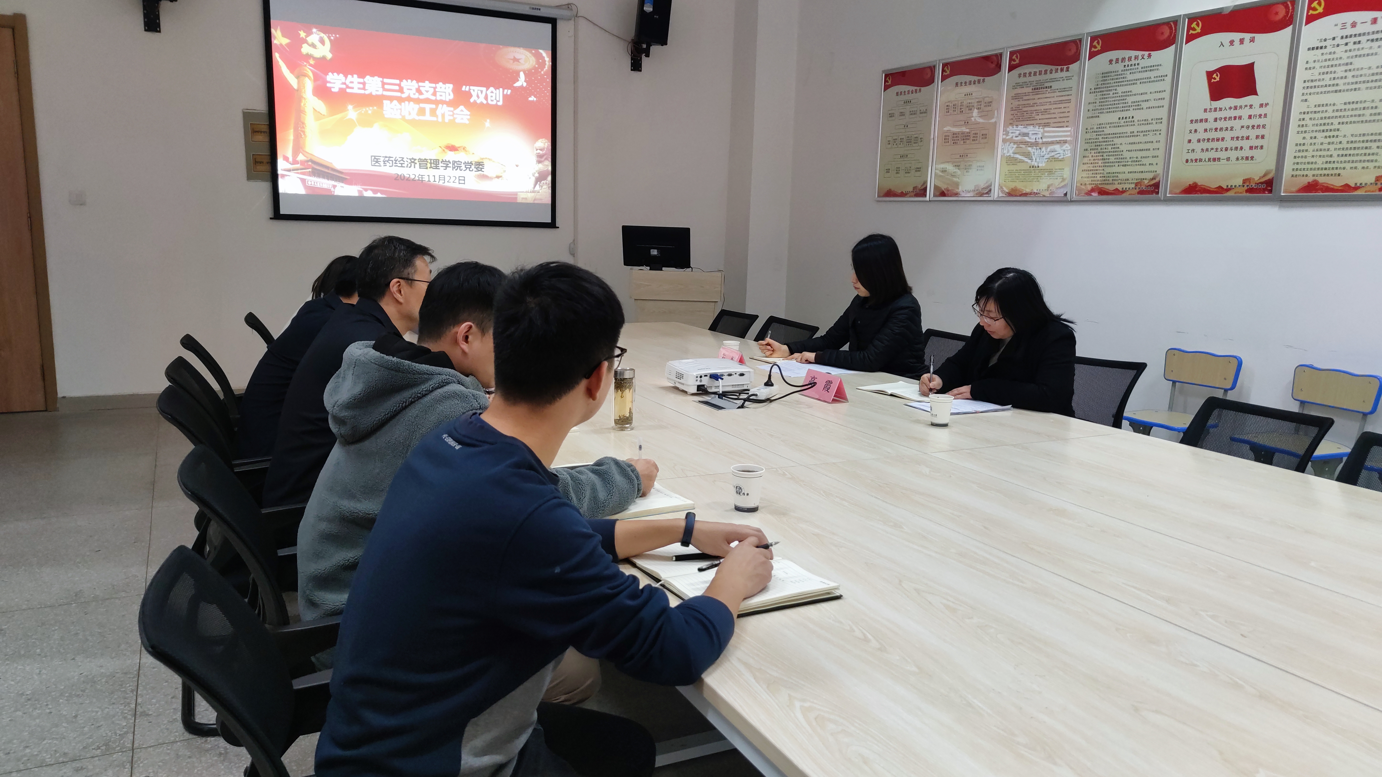 11月22日下午,学校党委组织部副部长高霞一行来到医药经济管理学院开展学生第三党支部“双创”实地验收工作,学院党委书记冯鑫,副书记、部分支部书记及组织员参加。