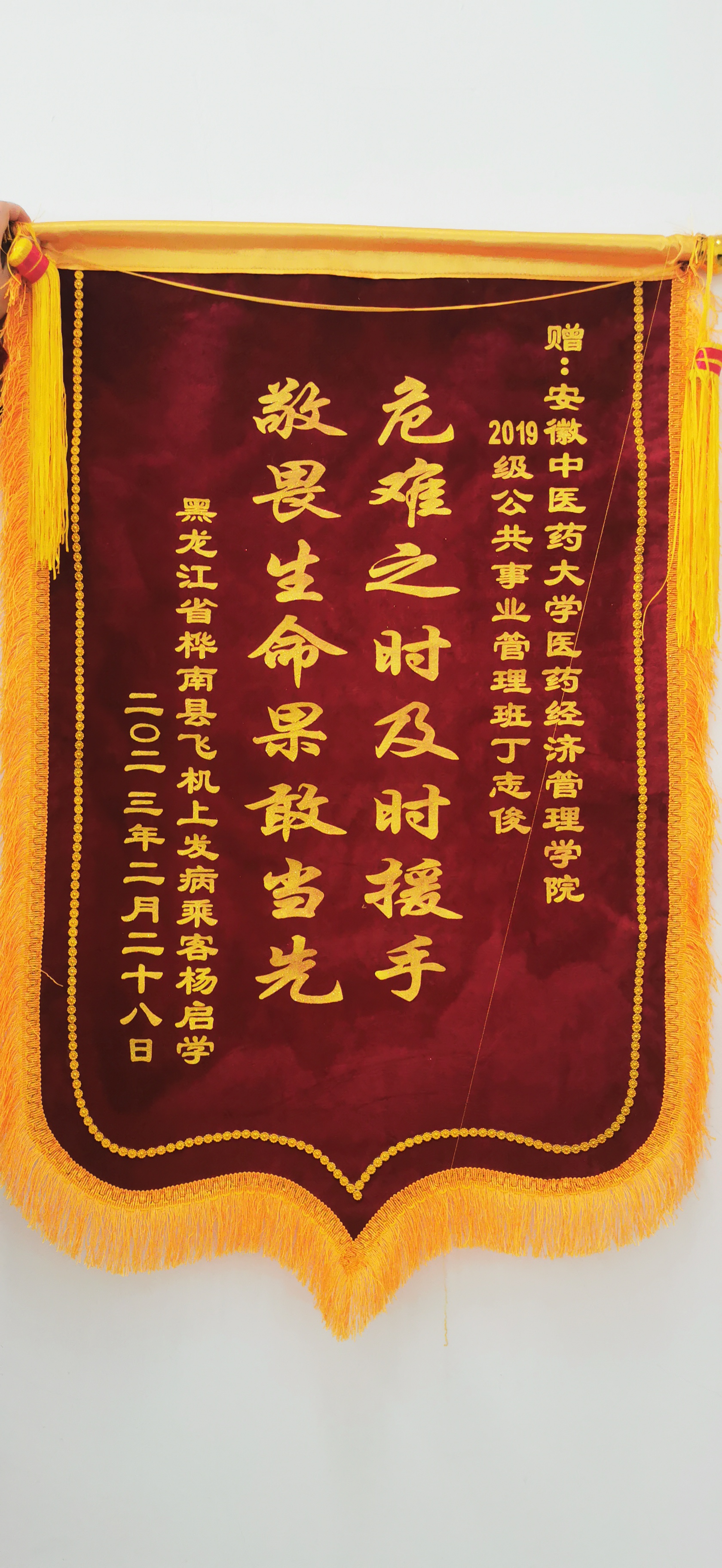 近日,医药经济管理学院收到一面锦旗,表达了对该院19公管班丁志俊在万米高空,挺身而出救人的感激之情。