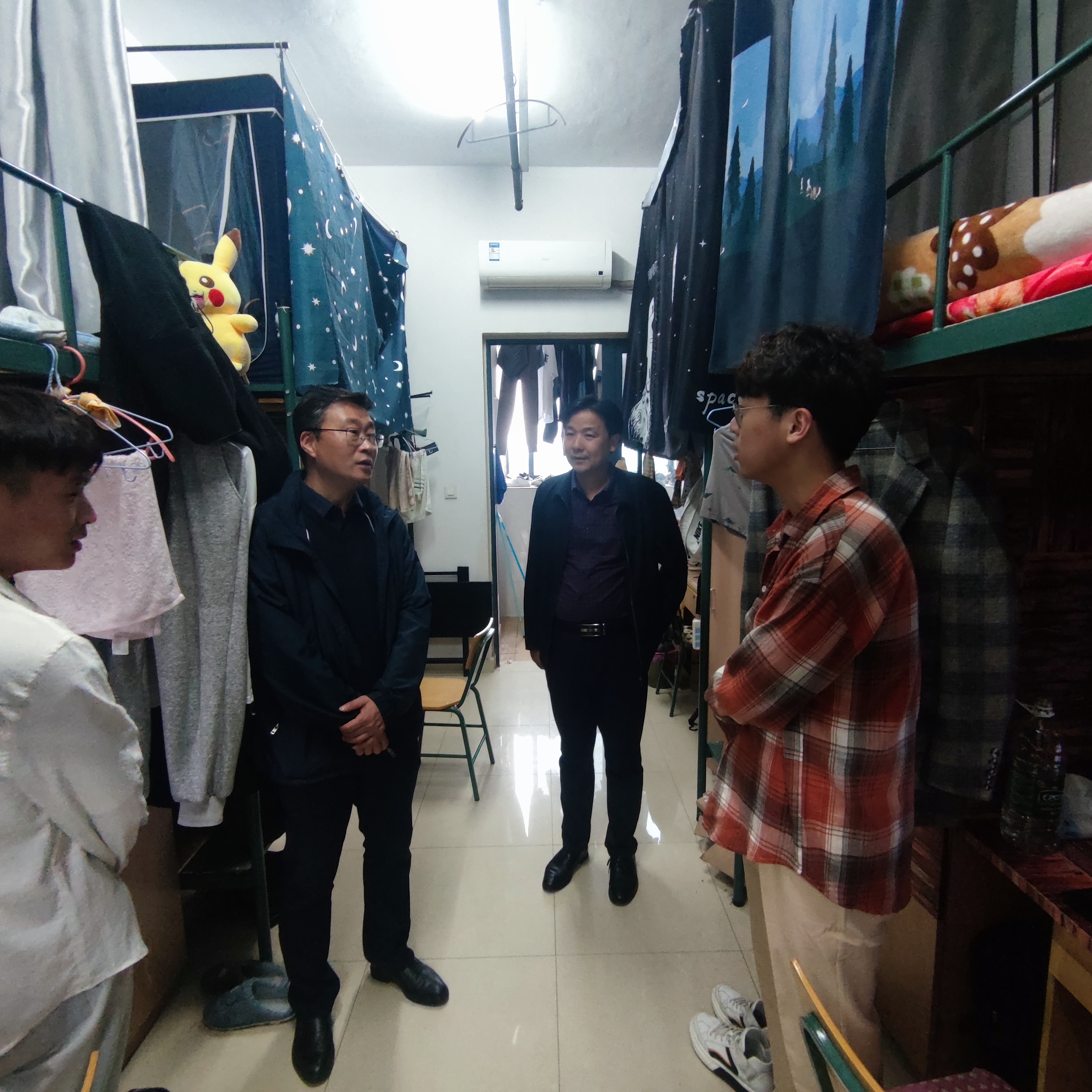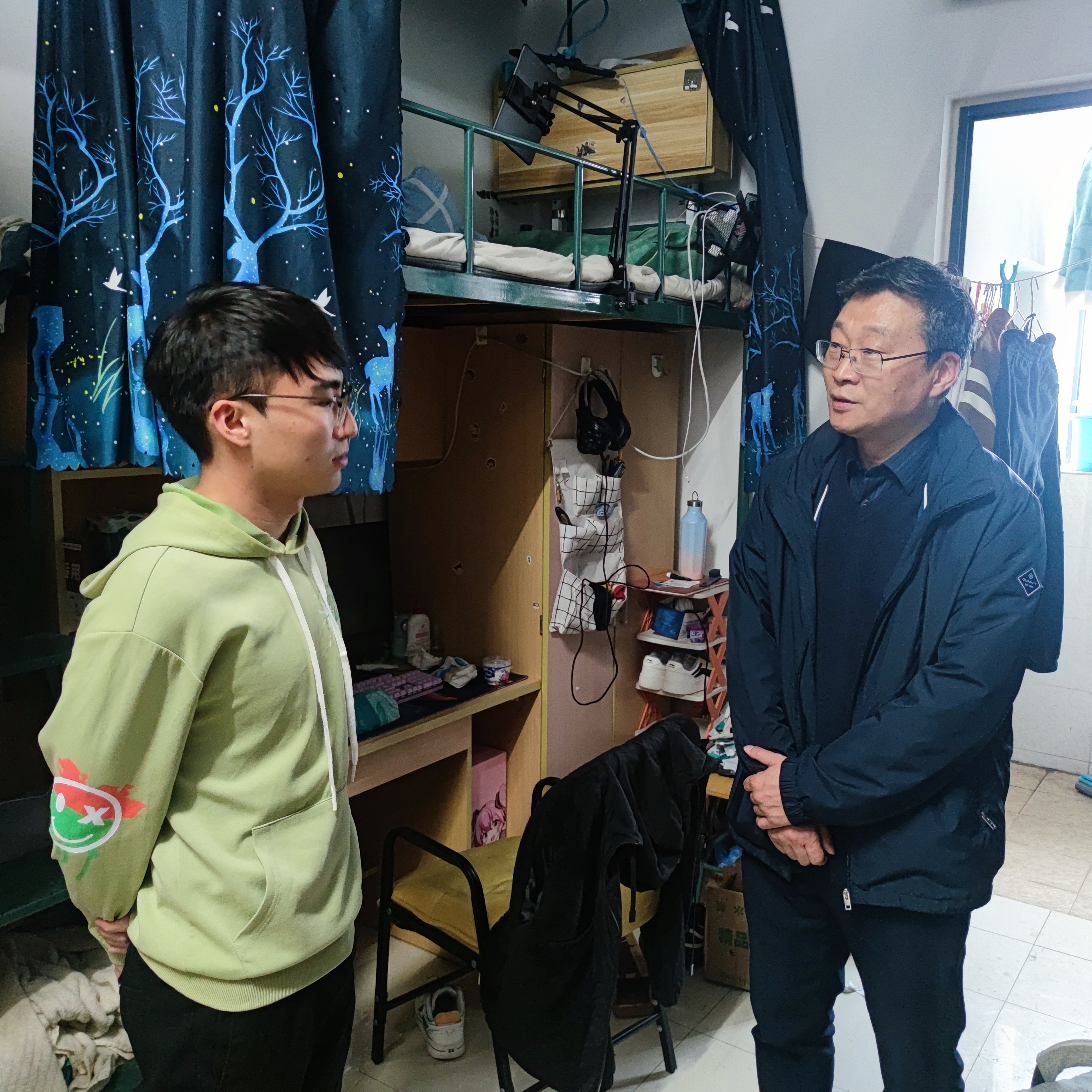 走访过程中,冯鑫与学生进行了亲切的交谈,一是询问了学生们“五一”假期的安排,叮嘱假期出行的学生要注意安全,特别是交通安全和防范网络电信诈骗,强调离校期间宿舍的水电安全;二是了解宿舍同学们的住宿情况,耐心听取同学们反馈的意见;三是鼓励高年级学生抓住实习机会,做好就业谋划和准备,不断提高自身素质,增强竞争优势。