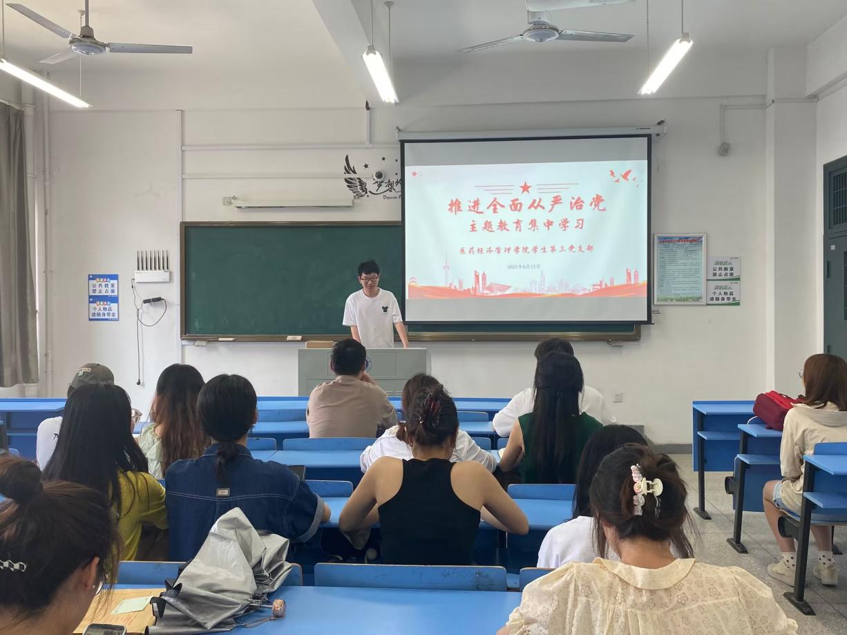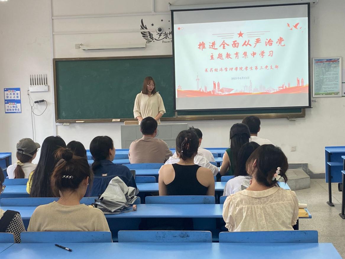 为深化党内教育,加强党支部思想政治建设,6月13日下午,医药经济管理学院学生第三党支部在教学楼B309开展学习贯彻习近平新时代中国特色社会主义思想主题教育专题集中学习。本次学习聚焦“推进全面从严治党”专题,支部教师党员和部分学生党员参加。
