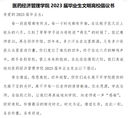 为进一步教育引导毕业生深植爱校荣校情怀,营造健康、文明、和谐、有序、暖心的毕业离校氛围,号召广大毕业生为母校留下一个好印象,为学弟学妹留下一个好榜样,为自己留下一个好回忆。根据学校有关文件精神,自五月底以来,医药经济管理学院开展毕业生文明离校系列活动。