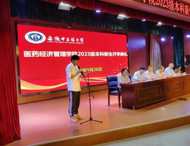 教师代表李志广以自己多年的求学经历,教导新生们要坚持不懈地学习,遇到困难要以坚韧的态度、积极的心态去面对。同时祝愿全体新生在大学期间以知识丰盈自我,书写人生精彩篇章。新生代表2023级国贸1班的陈雨珊同学回忆寒窗苦读的数十载,感谢父母与老师的栽培,对在医药经济学院未来的学习之旅充满期待。代表全体新生表示要继续努力,全面发展,勇敢地追求真知与梦想。老生代表“安徽省百优大学生”2020级国贸3班的冯辉同学分享了自己的大学学习与生活经历,以自身经验鼓励学弟学妹们勇敢地挑战自己、为梦想付出汗水,在大学里都能找到自己的兴趣所在并能够在各个领域取得成就。