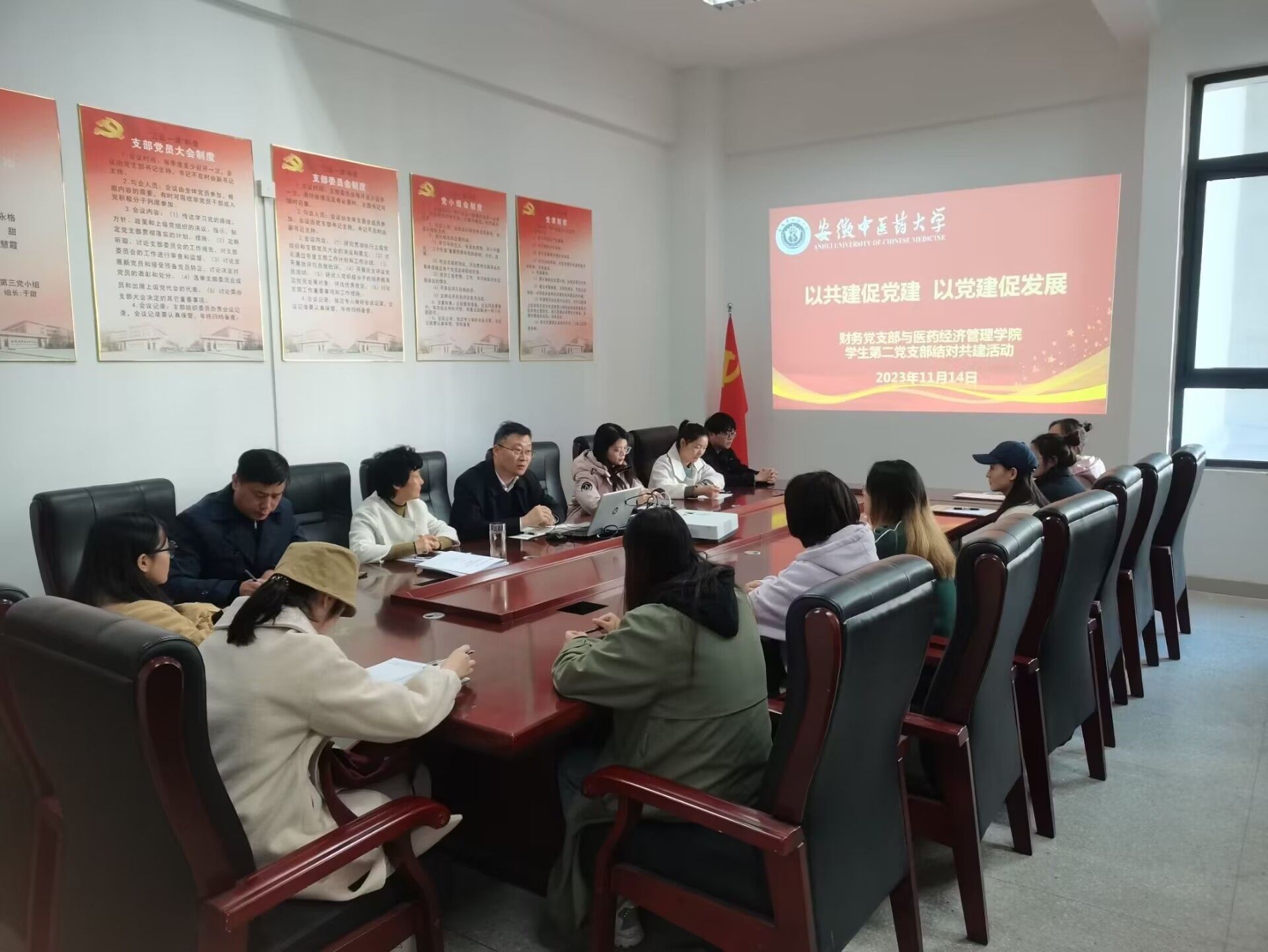 为落实学校党委《关于加强基层党建工作的若干举措》要求,11月14日下午,医药经济管理学院学生第二党支部联合机关党委财务党支部开展了以"支部共建凝聚,促进和谐发展"为主题的结对共建活动。医药经济管理学院党委书记冯鑫,财务党支部书记、财务处处长林永格,财务处副处长、医药经济管理学院学生第二党支部书记以及两个党支部30余名党员参加了活动。