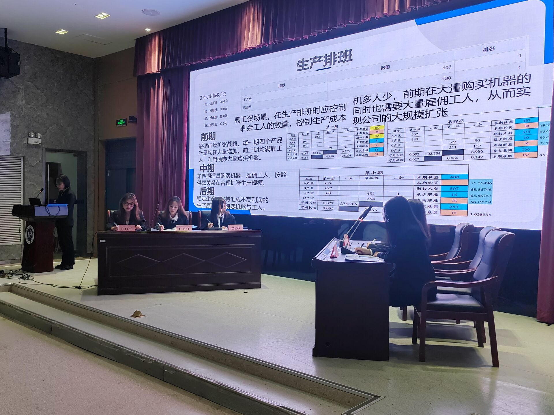 在决赛现场,各参赛选手精神饱满,自信大方,充分利用学习的经济理论和管理知识来阐述自己对于模拟企业经营中各种情况的理解,包括市场需求、机器技术、品牌效应、战略规划的优缺点等方面。经过PPT汇报、双方答辩、总结陈述等环节,芭比の梦想豪宅队(王彤、江文莲、郑静纯)获得一等奖,柴胡解郁队(陈佳秀、朱哲婉、王伟)、花儿为什么那样红队(谷铖、许彦茹、赵思远)获得二等奖,欣萍琪和队(戎梦萍、雷欣桐、童家琪)、嘟嘟小羊队(费祥、廖华超、张晗)、汪汪队(季一鸣、吕鹏睿、孙保友)获得三等奖。