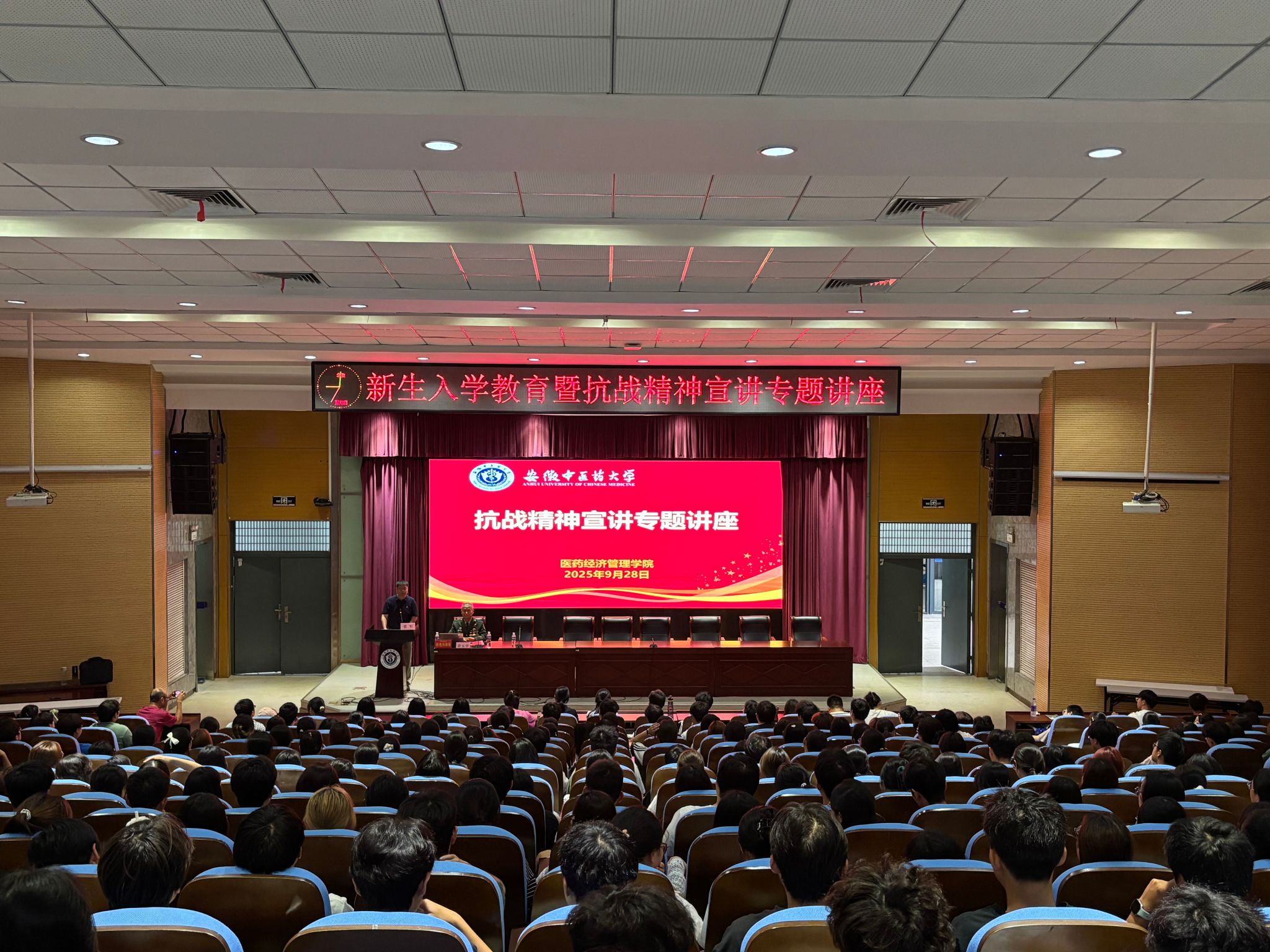 928日上午,医药经济管理学院举行2025级新生入学教育暨 “弘扬伟大抗战精神,为实现强国建设民族复兴伟业而奋斗专题讲座。学院特邀全国高校中国共产党人精神谱系宣讲团成员、全国模范退役军人、全国离退休干部先进个人许玉亭同志担任主讲嘉宾。学院党委书记张军主持宣讲,2025级全体新生及新生辅导员共同聆听了这场深刻而富有教育意义的报告。