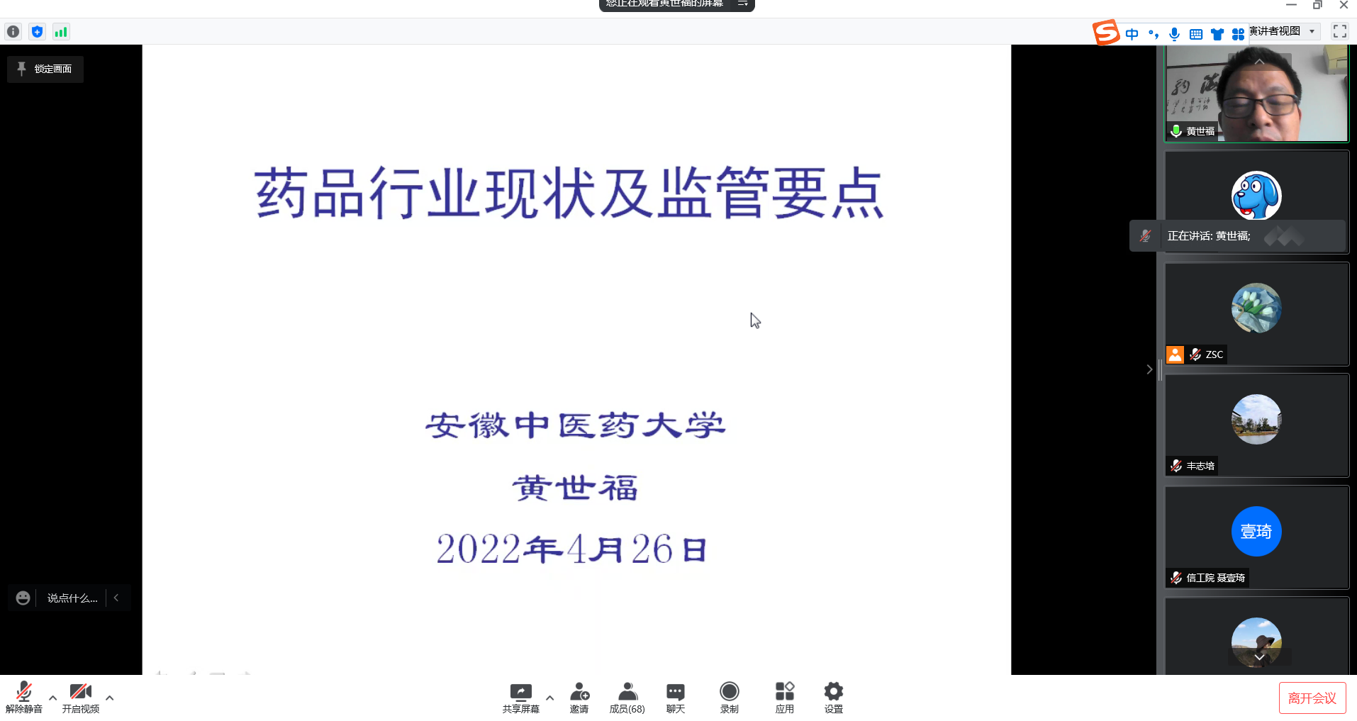 4月26日下午,医药经济管理学院举办2022年第一期“我与公共部门领导专家面对面”专题系列学术讲座,邀请安徽省药品审评查验中心副主任黄世福、安徽省药品审评查验中心副研究员钱利武分别担任主讲,讲座通过线上会议方式开展,由院长丰志培主持,副院长陶群山、学院教职工及公共管理学位点全体硕士研究生参加。