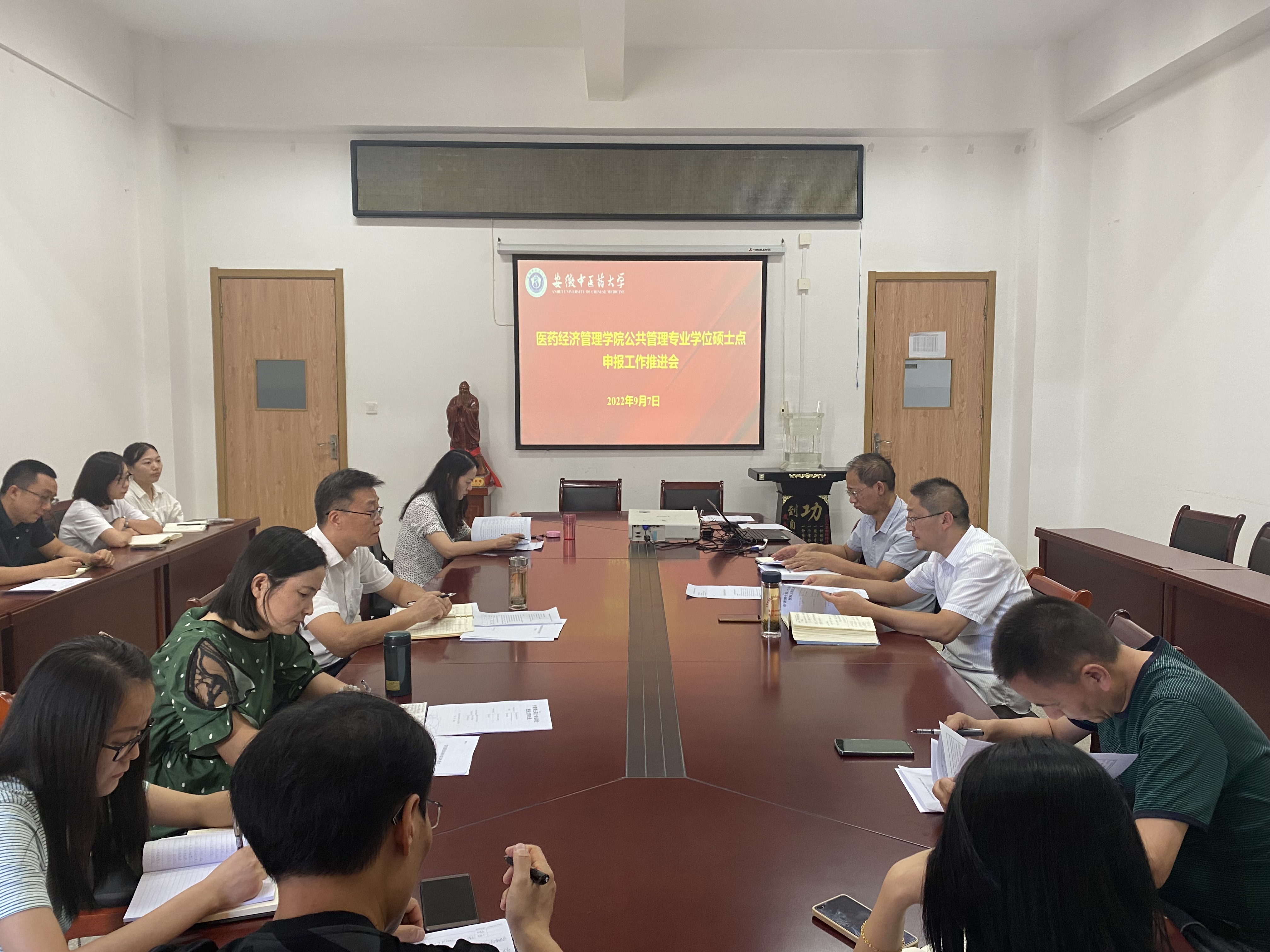 9月7日下午,医药经济管理学院召开公共管理专业学位硕士点申报工作推进会,学院党委书记冯鑫、院长丰志培、副院长陶群山以及公共管理专业学位硕士点申报工作专班成员参加会议。