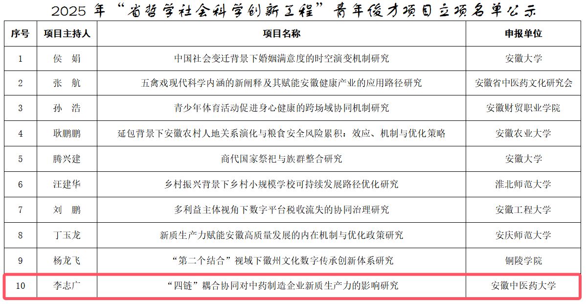近日,安徽省社会科学界联合会2025年“省哲学社会科学创新工程”优秀青年项目及创新团队入选名单已结束公示,学院李志广副教授入选2025年“省哲学社会科学创新工程”青年俊才项目,为学院再添一项重量级荣誉。