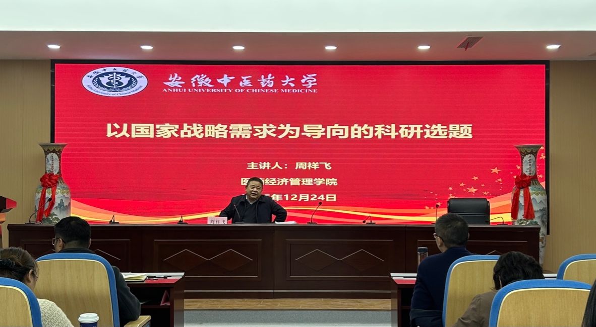 2024年12月24日,医药经济管理学院特邀安徽省社科联党组成员、副主席周祥飞来院,开展题为《以国家战略需求为导向的科研选题》的专题讲座。活动由院长丰志培主持,学院党政领导班子、全体教职工及硕士研究生共同参加。