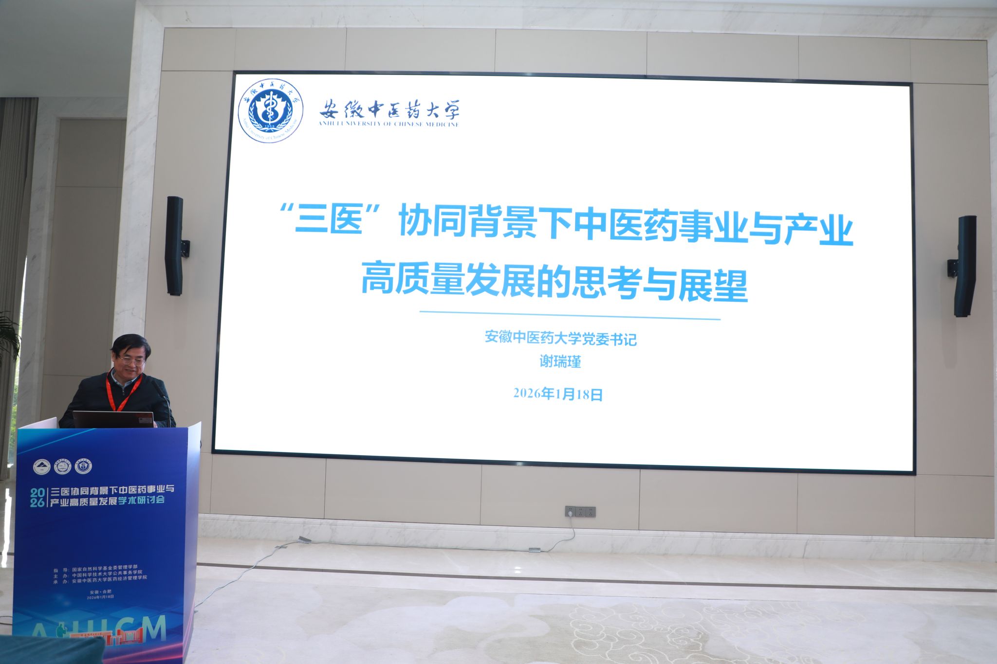 安徽中医药大学党委书记谢瑞瑾教授首先致辞,代表学校对各位领导、专家的莅临表示热烈欢迎。他强调,当前中医药事业和产业高质量发展亟需破题,希望借助此次研讨会,探索三医协同背景下中医药发展的新机制、新路径、新模式,为健康中国和中国式现代化建设作出新贡献。