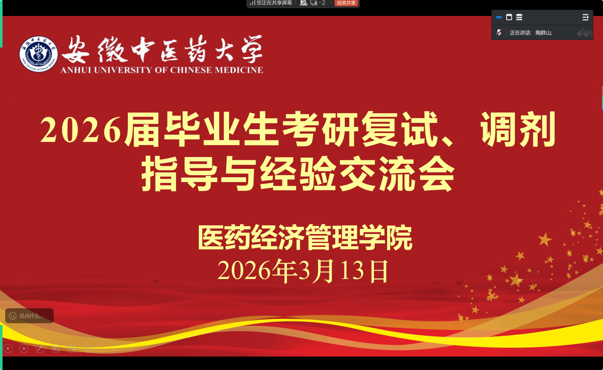 为切实做好毕业生考研指导与服务工作,帮助2026届学子在复试与调剂阶段取得更好成绩,医药经济管理学院于3月13日组织召开考研复试与调剂经验交流会。会议由副院长陶群山主持,经济系主任倪飞及四位在读研究生代表应邀作经验分享。