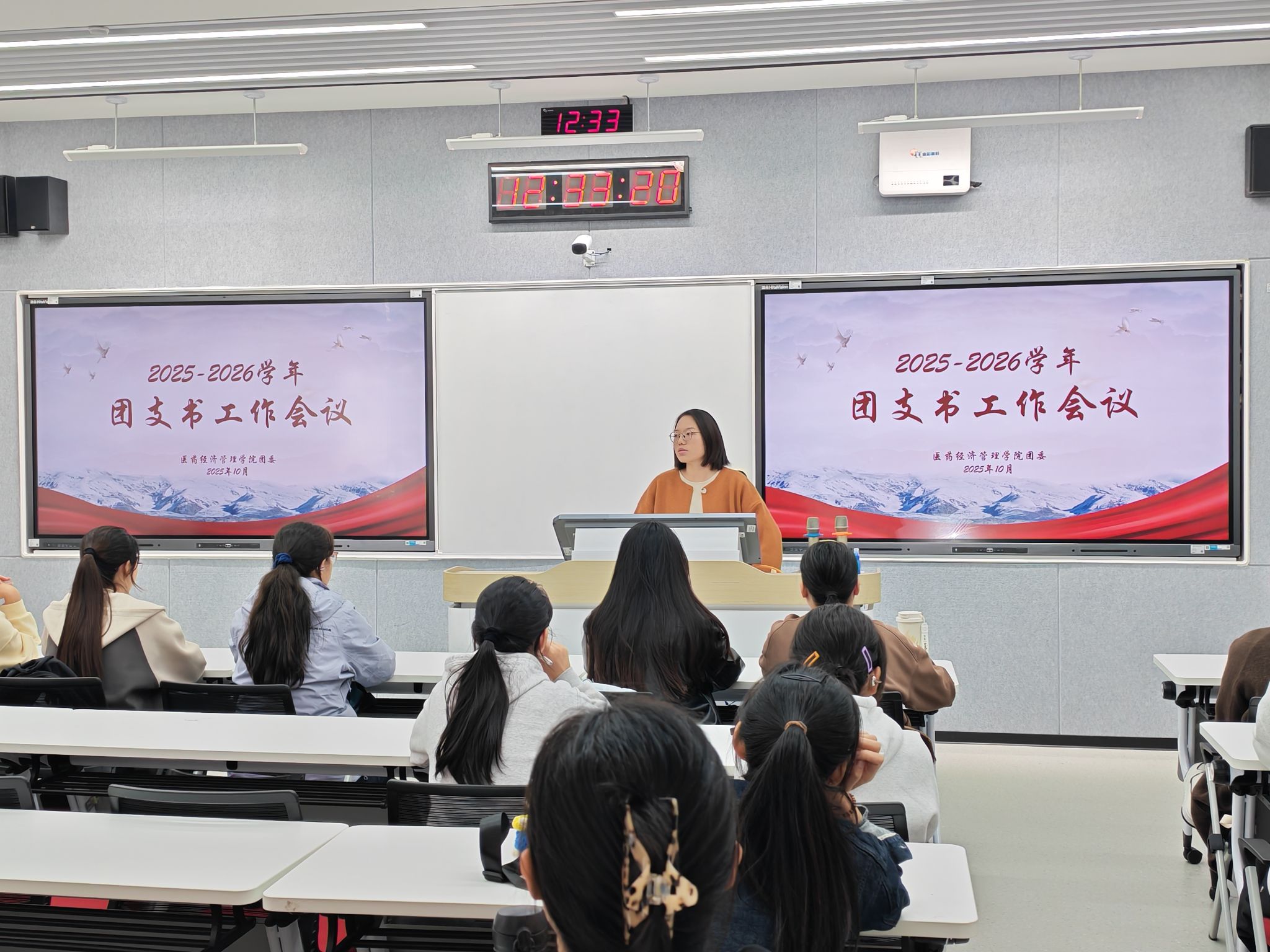本次会议分为两个部分展开。一是概述了学院团学工作情况,对团支部组织架构与职责、团员管理、“三会两制一课”制度、团支部推优等内容进行了详细介绍,帮助全体团支书尤其是2025级新生班团支部更好地认识团支部的职能和要求,从而有序开展各项工作。二是围绕近期重点工作进行部署,包括新生团组织关系的转接、团支部工作手册的记录、团员的教育与管理、主题团日活动的开展等。同时,张亚丽老师鼓励各班团支书结合年级专业主动谋划团支部活动品牌,建设功能突出、活力充沛的团支部。