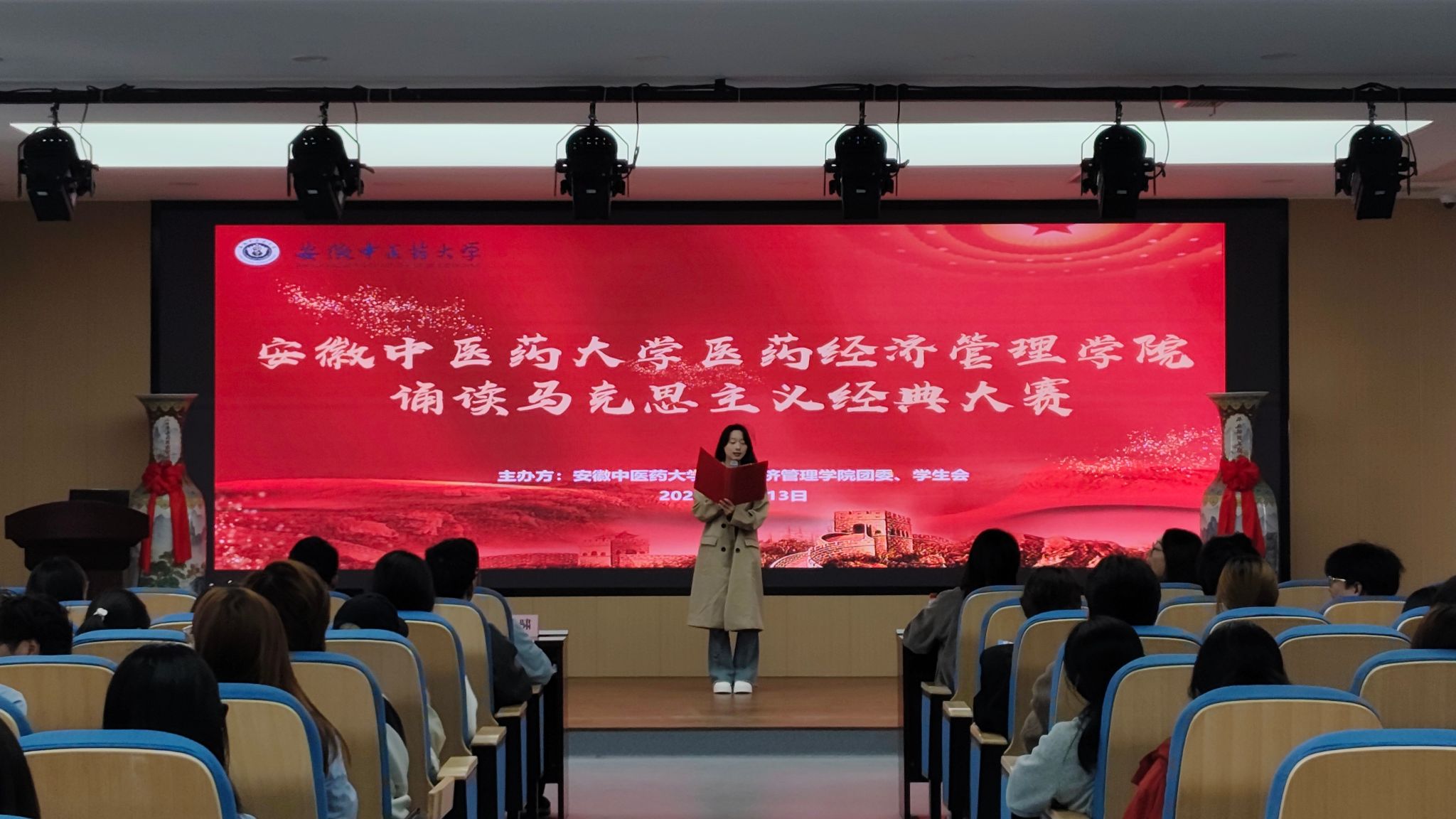 为深入学习贯彻习近平新时代中国特色社会主义思想,全面弘扬党的二十届四中全会精神,11月13日,医药经济管理学院在惟是楼429报告厅举办“诵读马克思主义经典”大赛院级选拔赛。本次赛事特邀马克思主义学院尤志成老师、宣传部孙孝涧老师以及学院党委副书记谢啸老师担任评委。