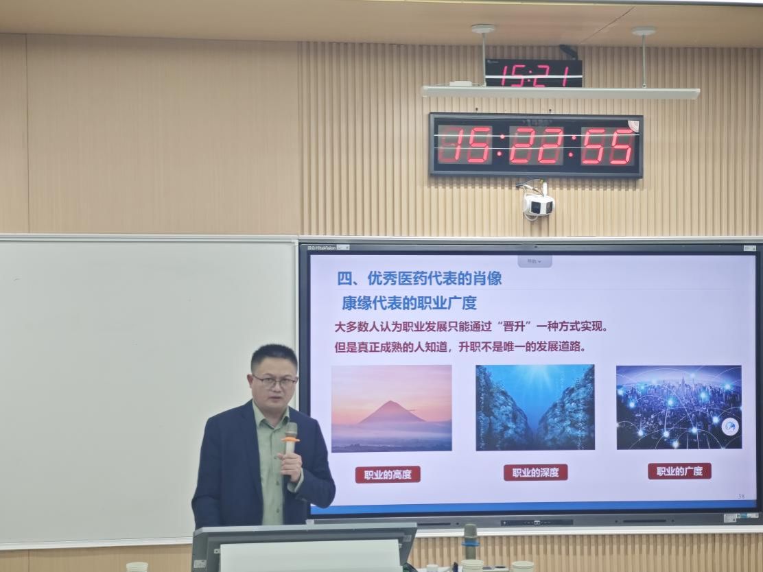 王永伟系统回顾了医药贸易相关岗位的发展历程,指出其在药品流通、市场服务与临床支持等方面发挥着重要作用。他重点分析了当前医药行业的发展机遇,强调国家对中医药创新的政策支持以及“健康中国2030”规划的实施为医药贸易专业人才带来了广阔的发展空间。结合康缘药业的企业实践与个人十九年的行业经验,王永伟详细阐述了医药贸易职业应具备的核心素养,鼓励同学们树立以客户为中心的价值观,在专业化与合规发展的道路上实现职业理想。